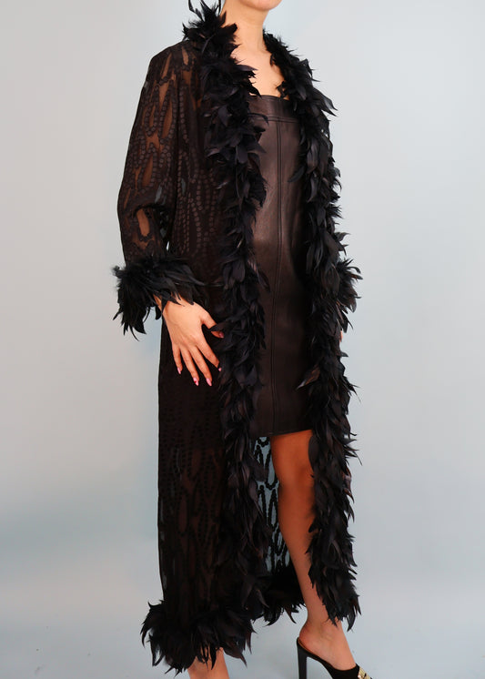 Yves Saint Laurent 1970s Black Feather Trim Robe Jacket