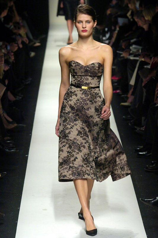 Celine Fall 2004 Runway Lace Print Corseted Strapless Dress