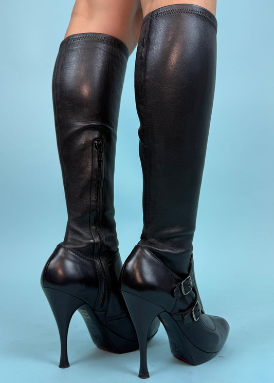 Celine Black Leather Buckle Heeled Boots
