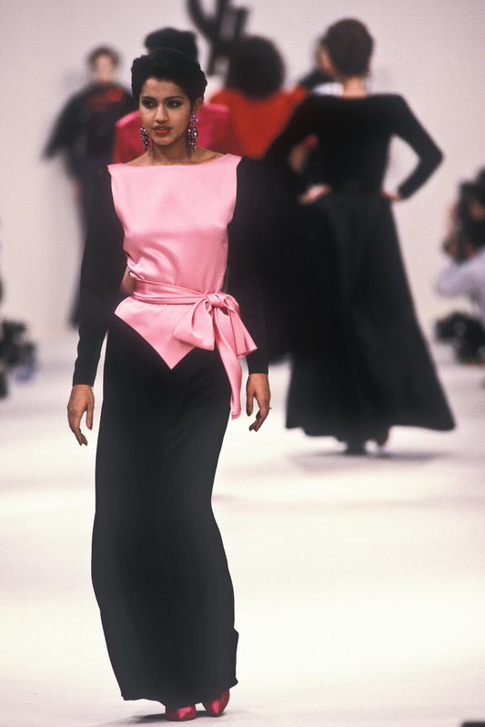 Yves Saint Laurent Fall 1986 Runway Black & Pink Silk Bow Sash Dress