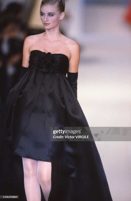 Givenchy Haute Couture 1980s Black Silk Strapless Rose Corsage Gown
