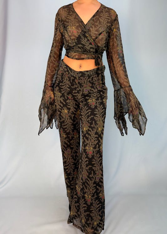 Betsey Johnson 1990's Floral Chiffon Flare Pants & Wrap Top Set