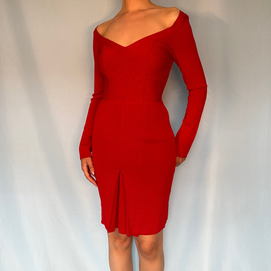 Herve Leger Red Long Sleeve Pleat Skirt Plunge Bandage Dress