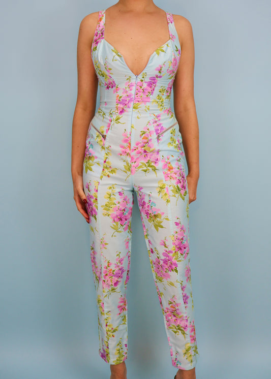 Thierry Mugler 1990s Blue Floral Zip Up Jumpsuit