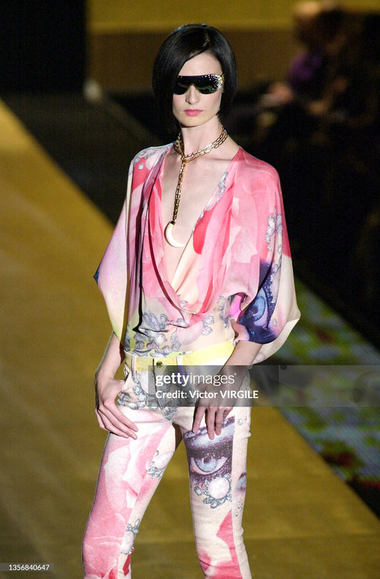 Roberto Cavalli Spring 2001 Runway Pink Face Print Cowl Knit Top & Jeans Set
