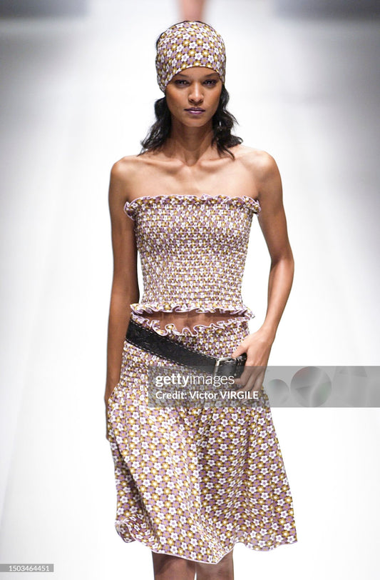 Celine Spring 2002 Floral Silk Shirred Strapless Dress