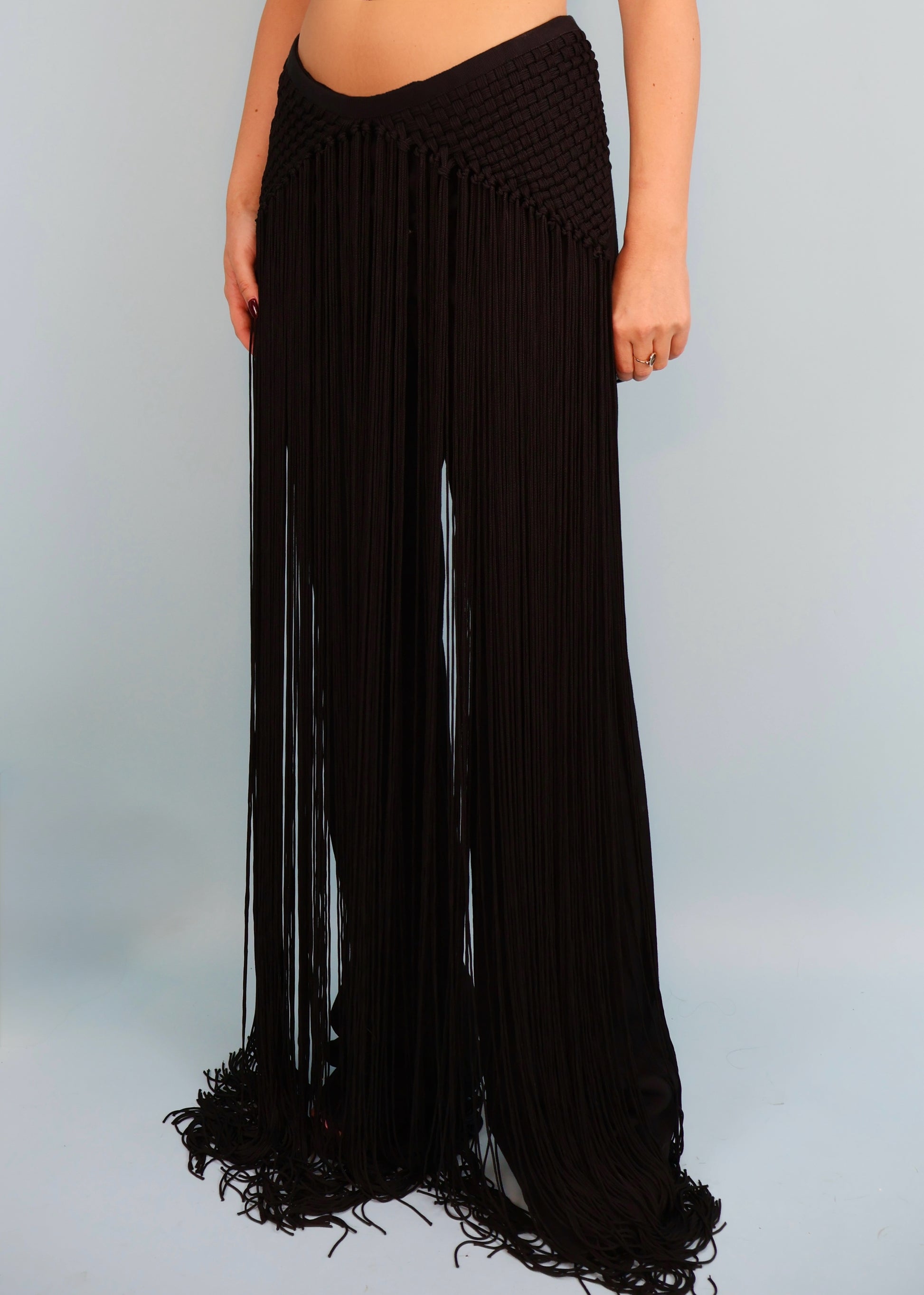 Black low rise trousers with long fringe