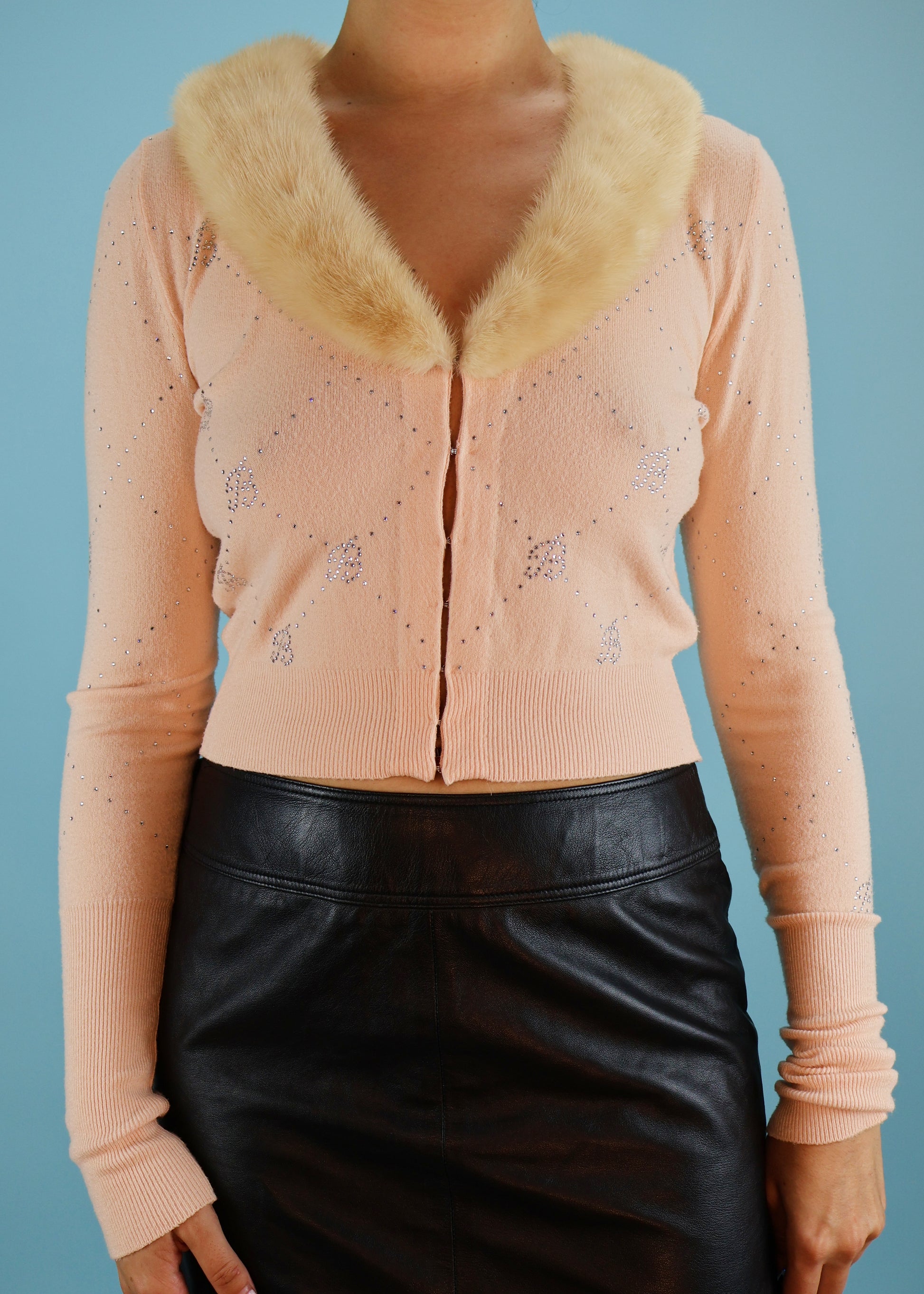 Blumarine Spring 2005 Runway Pink Rhinestone & Fur Collar Cardigan