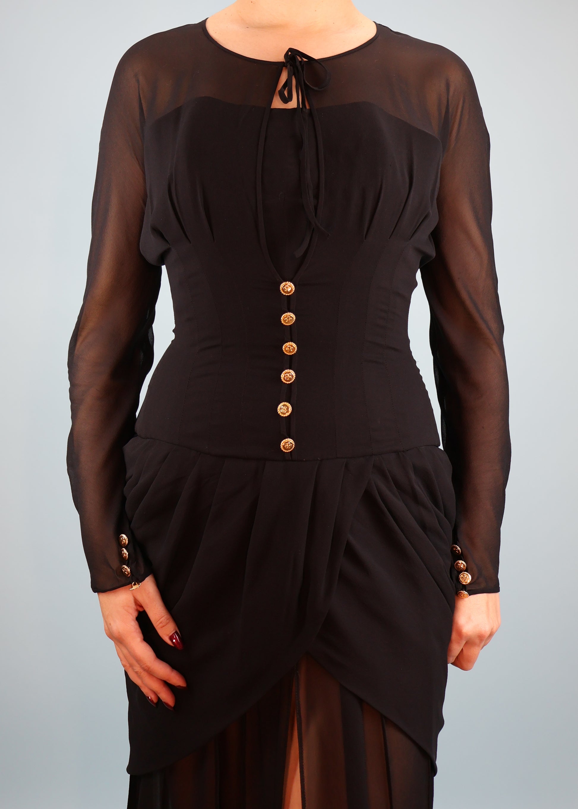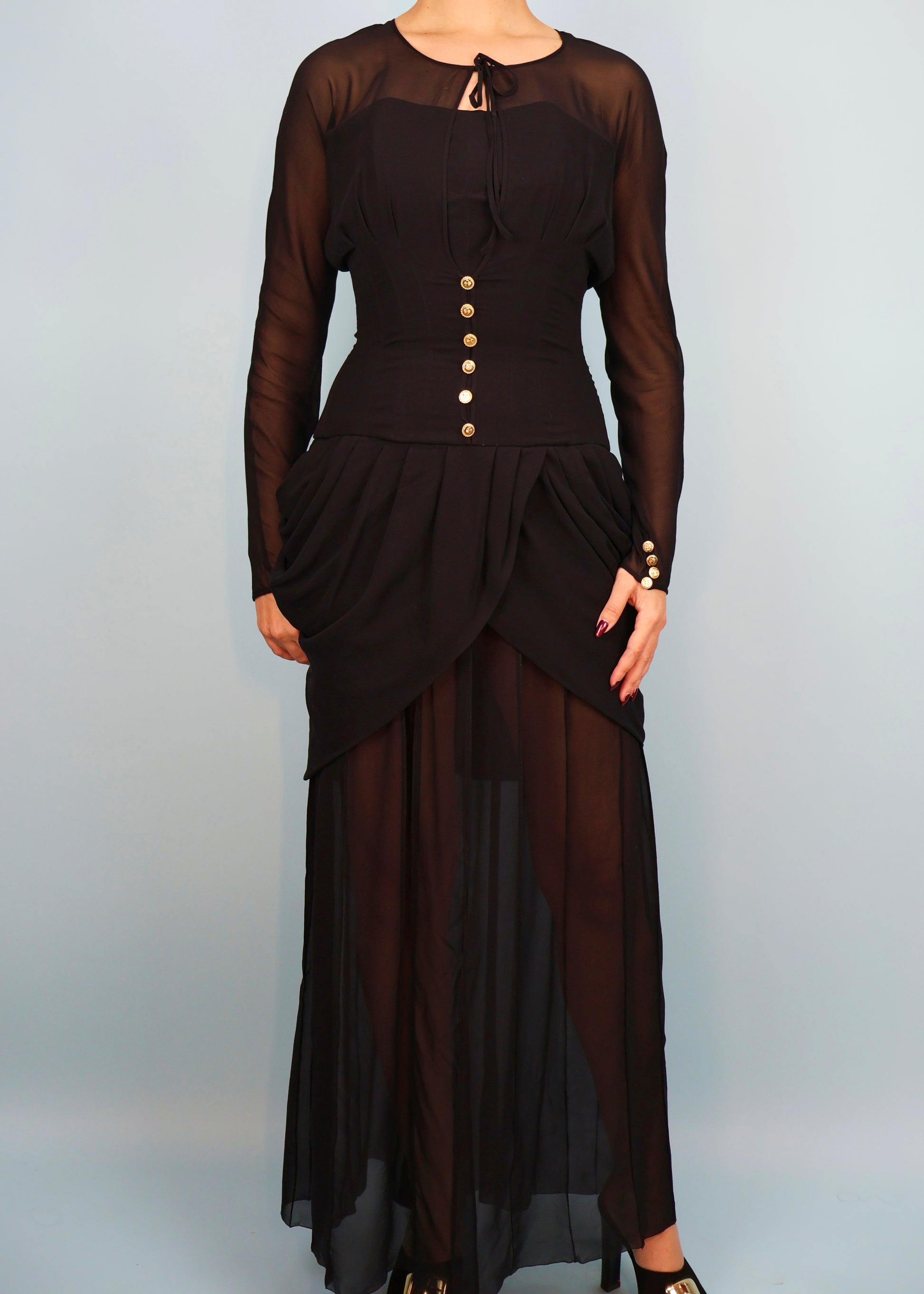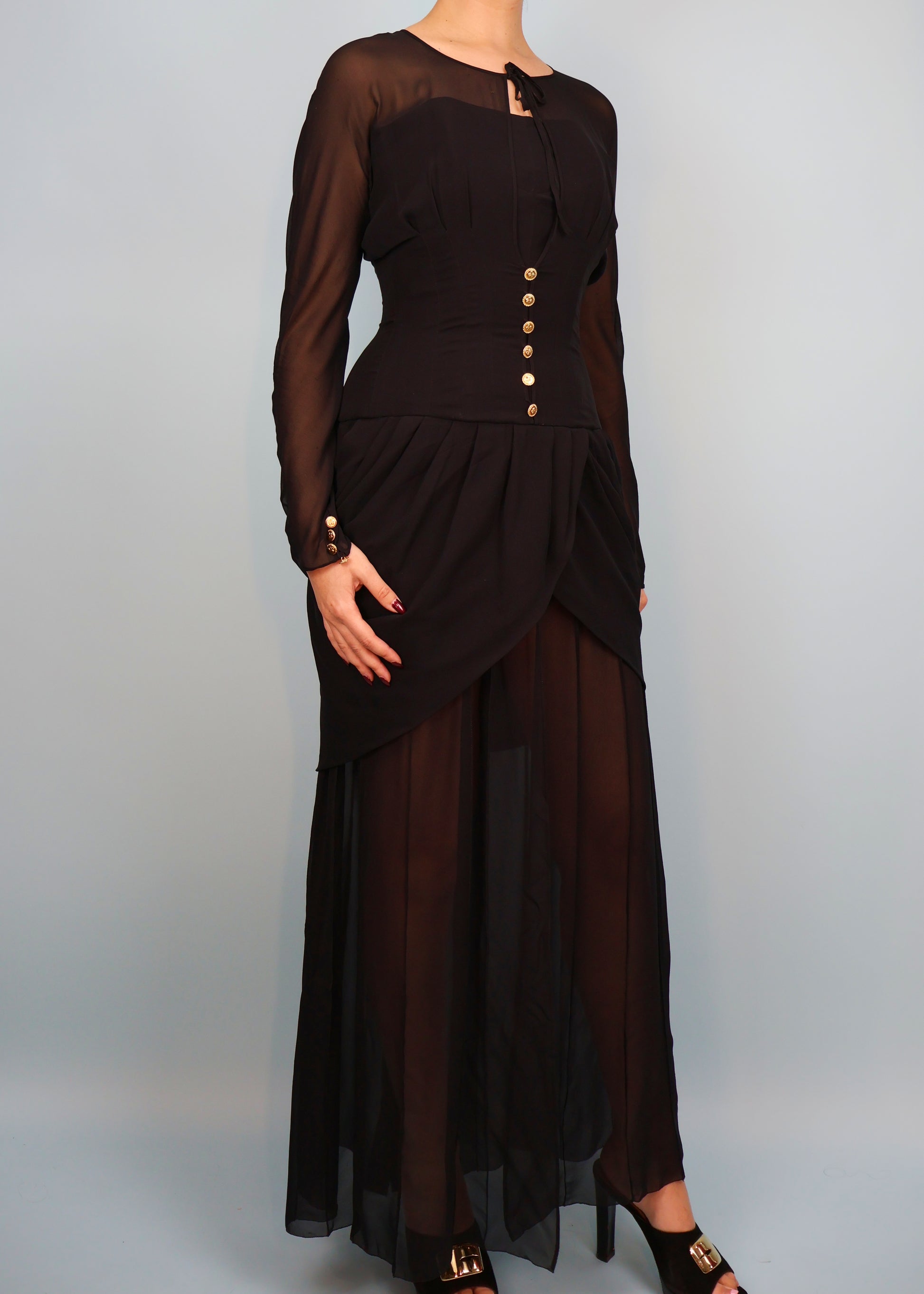 Black silk chiffon draped gown