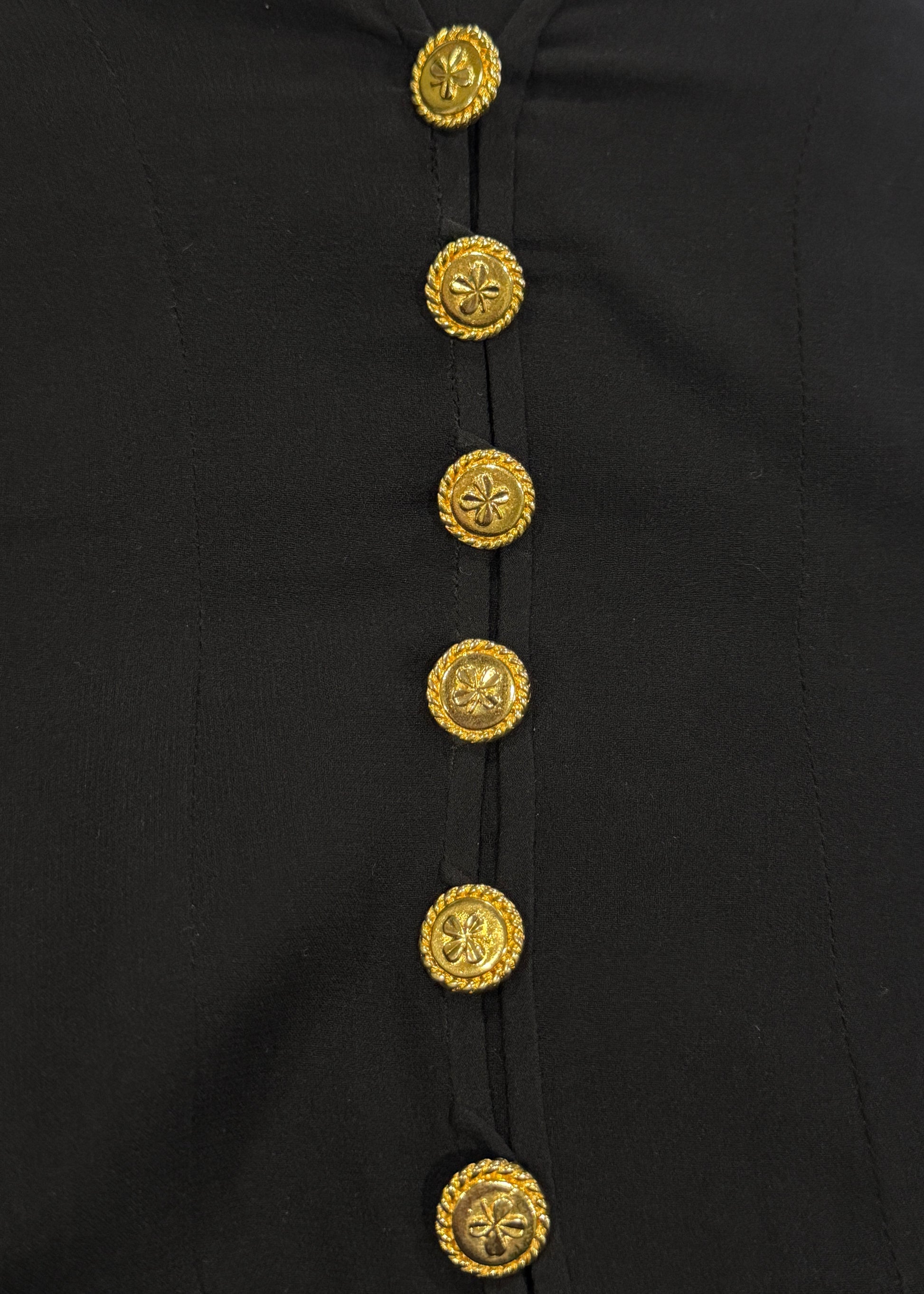 Gold four leaf clover buttons on bodice, cuffs and back of skirt