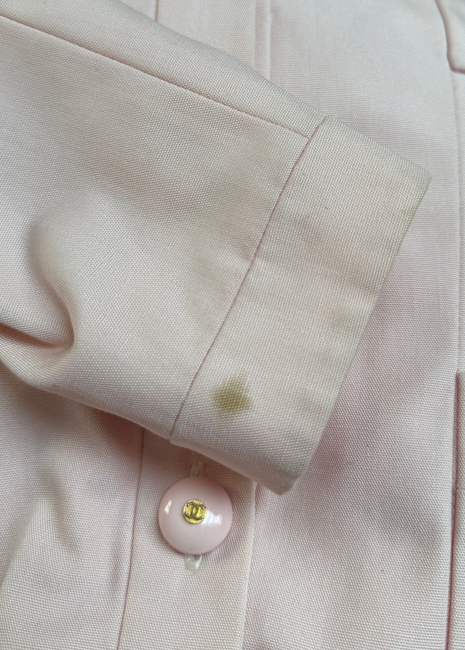 Some discolouration on inside neckline. Mark on outside cuff.