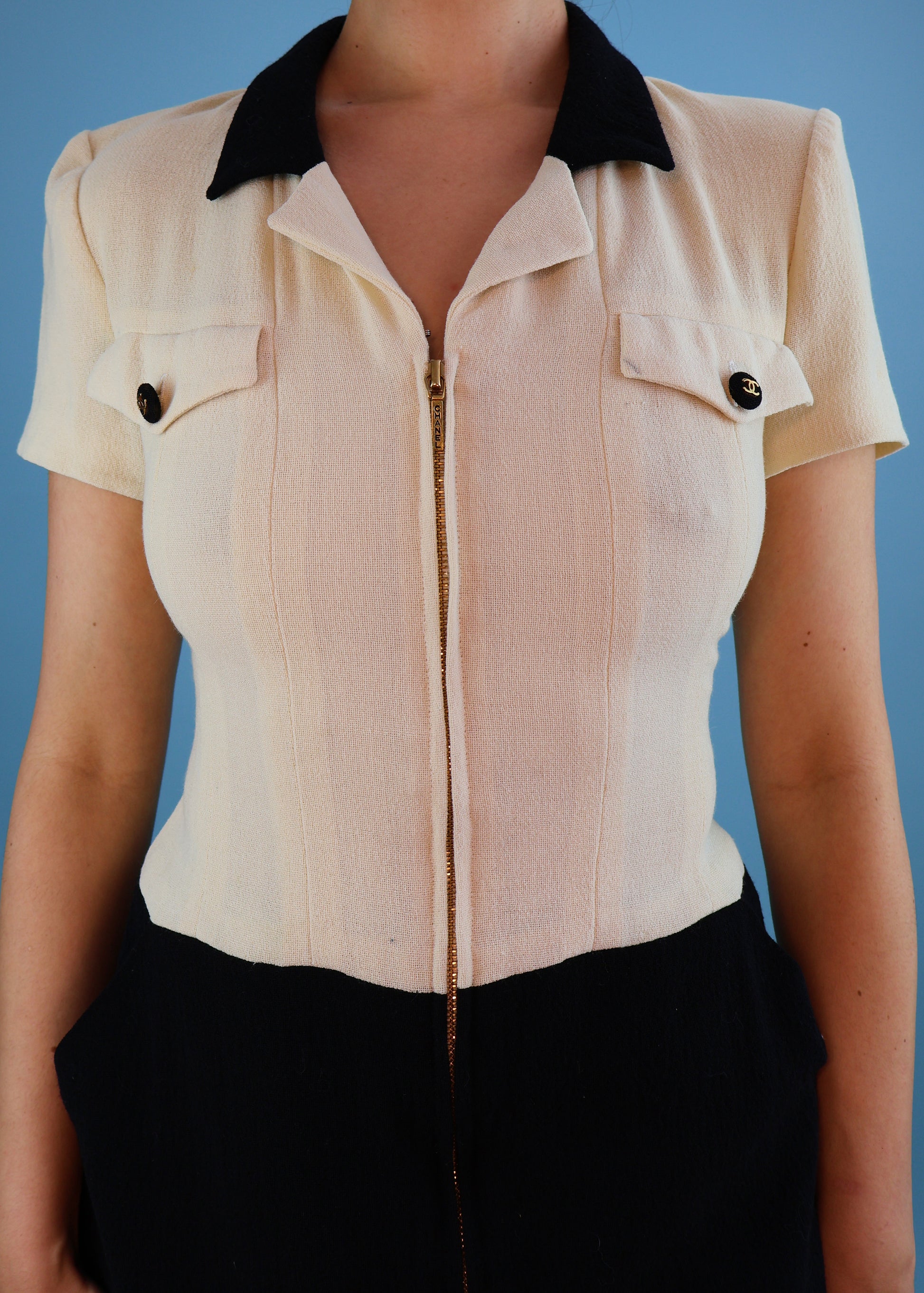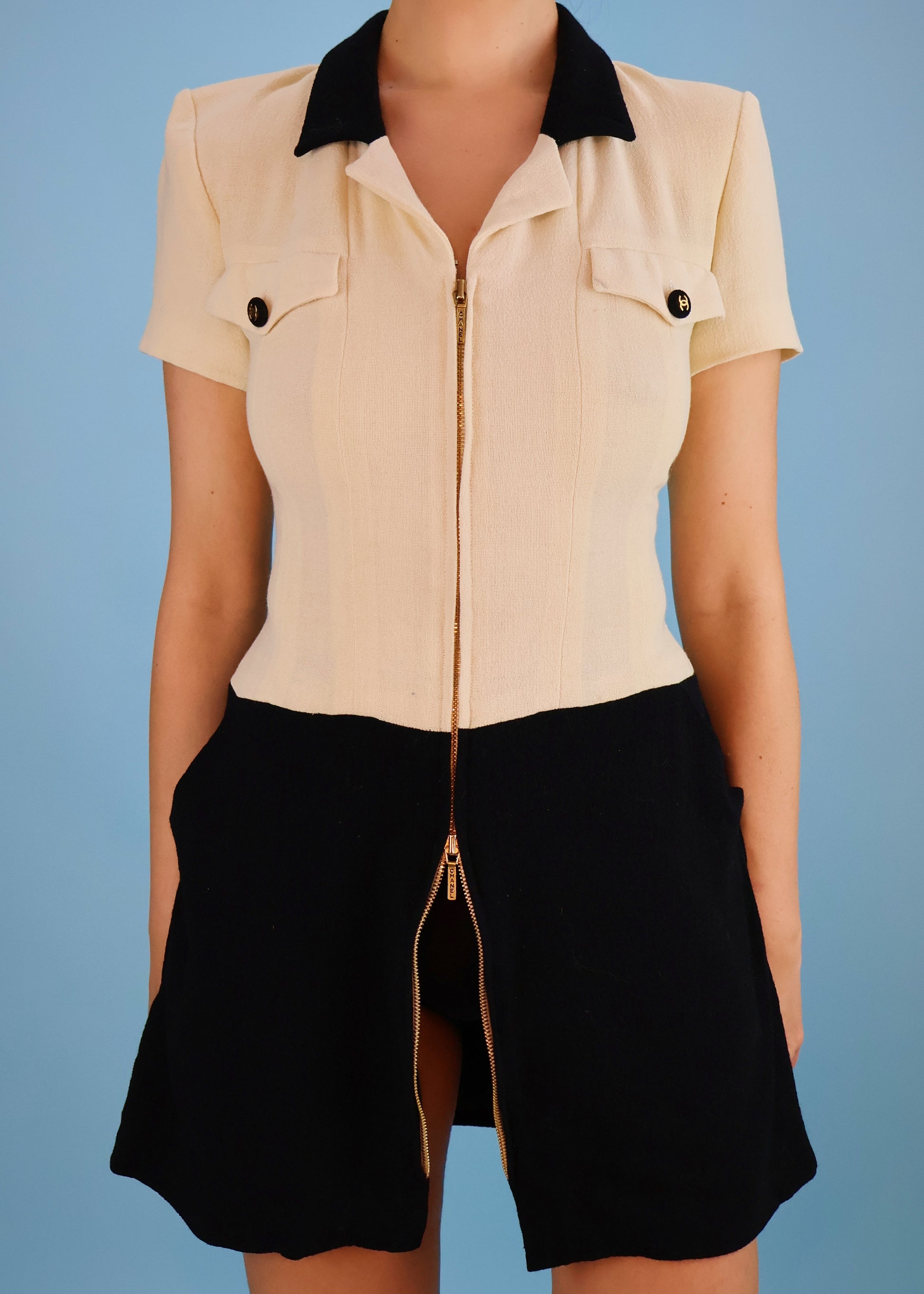 Chanel Spring 1995 Runway Cream & Black Zip Up Mini Dress