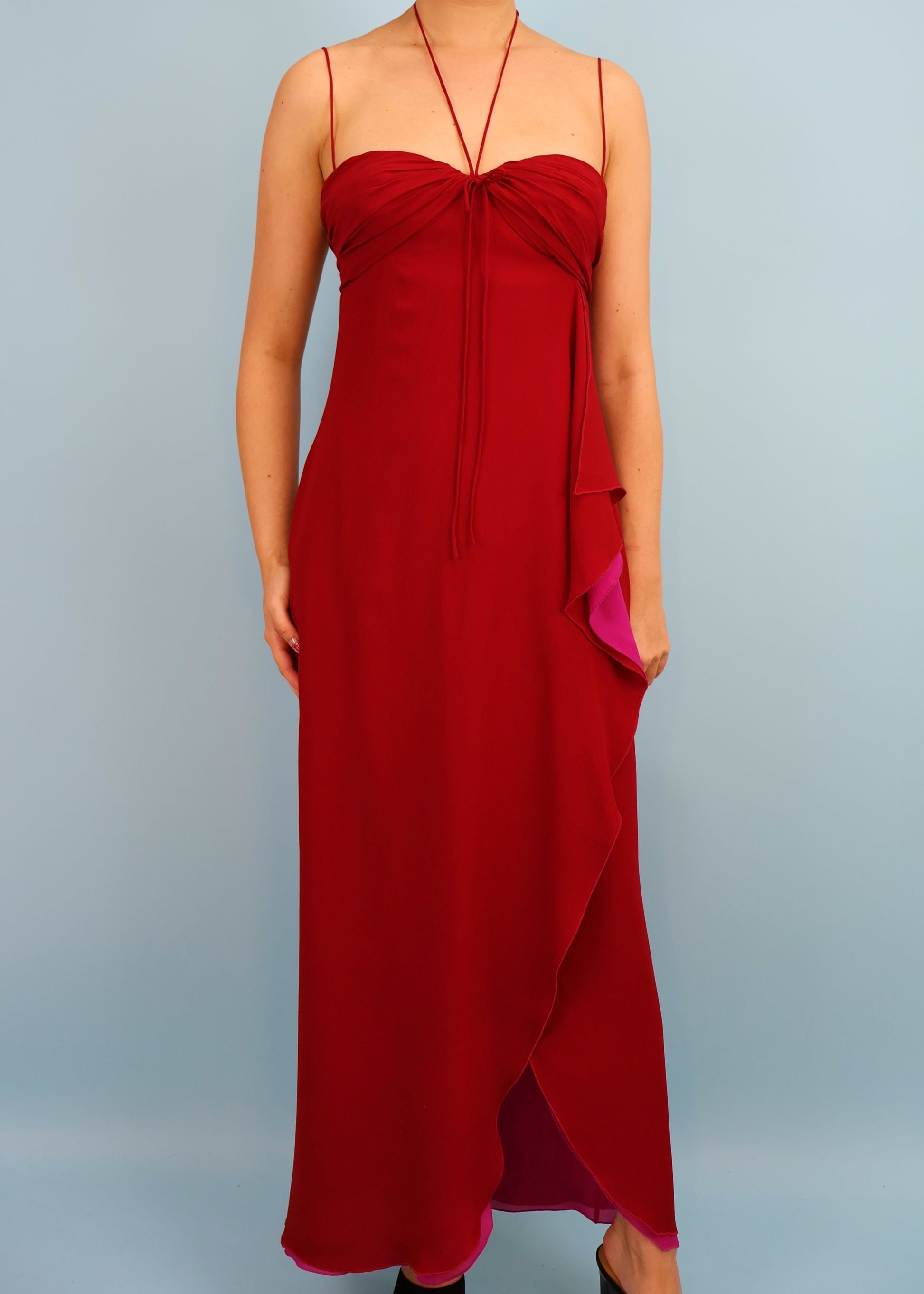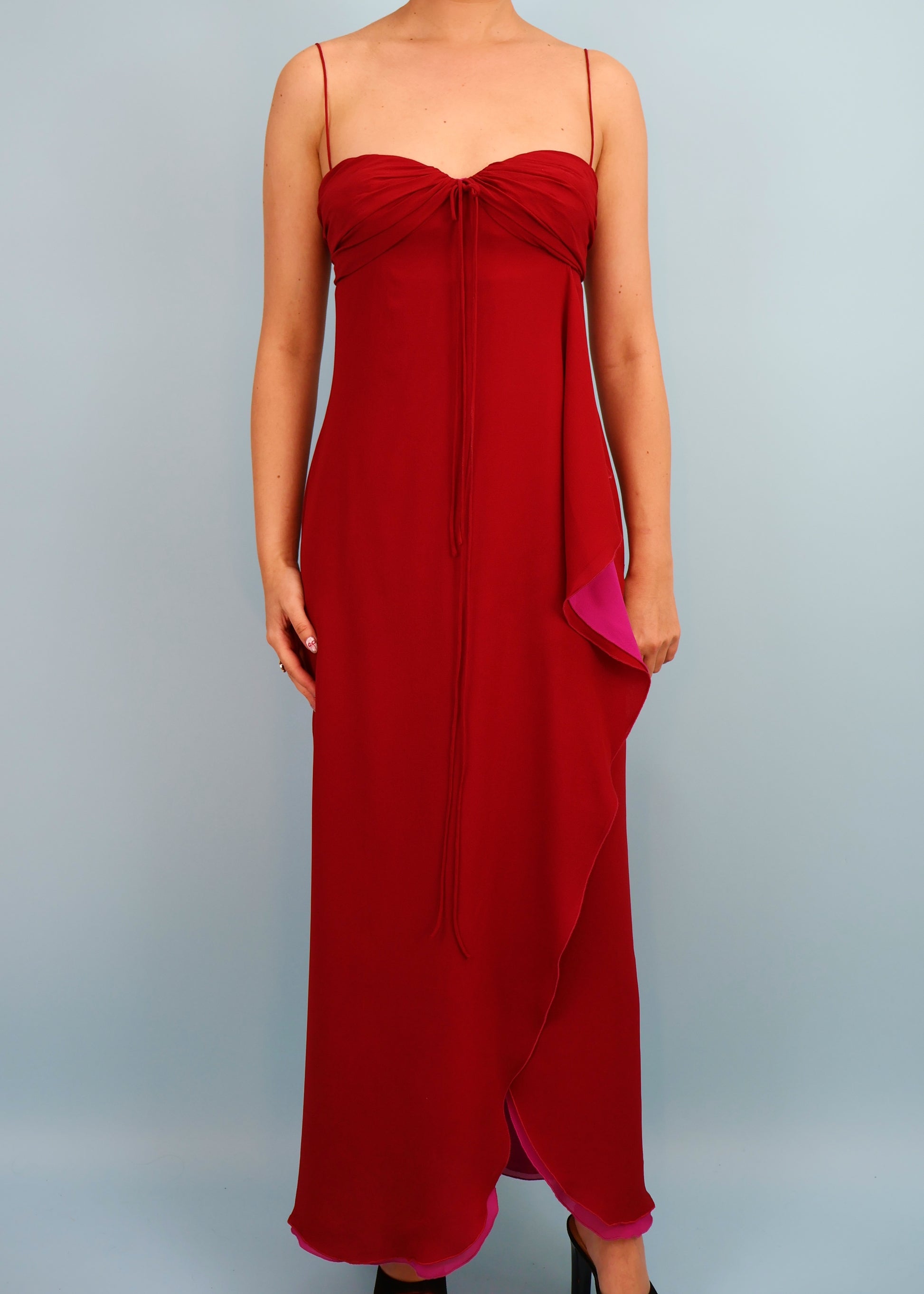 Red silk chiffon full length dress