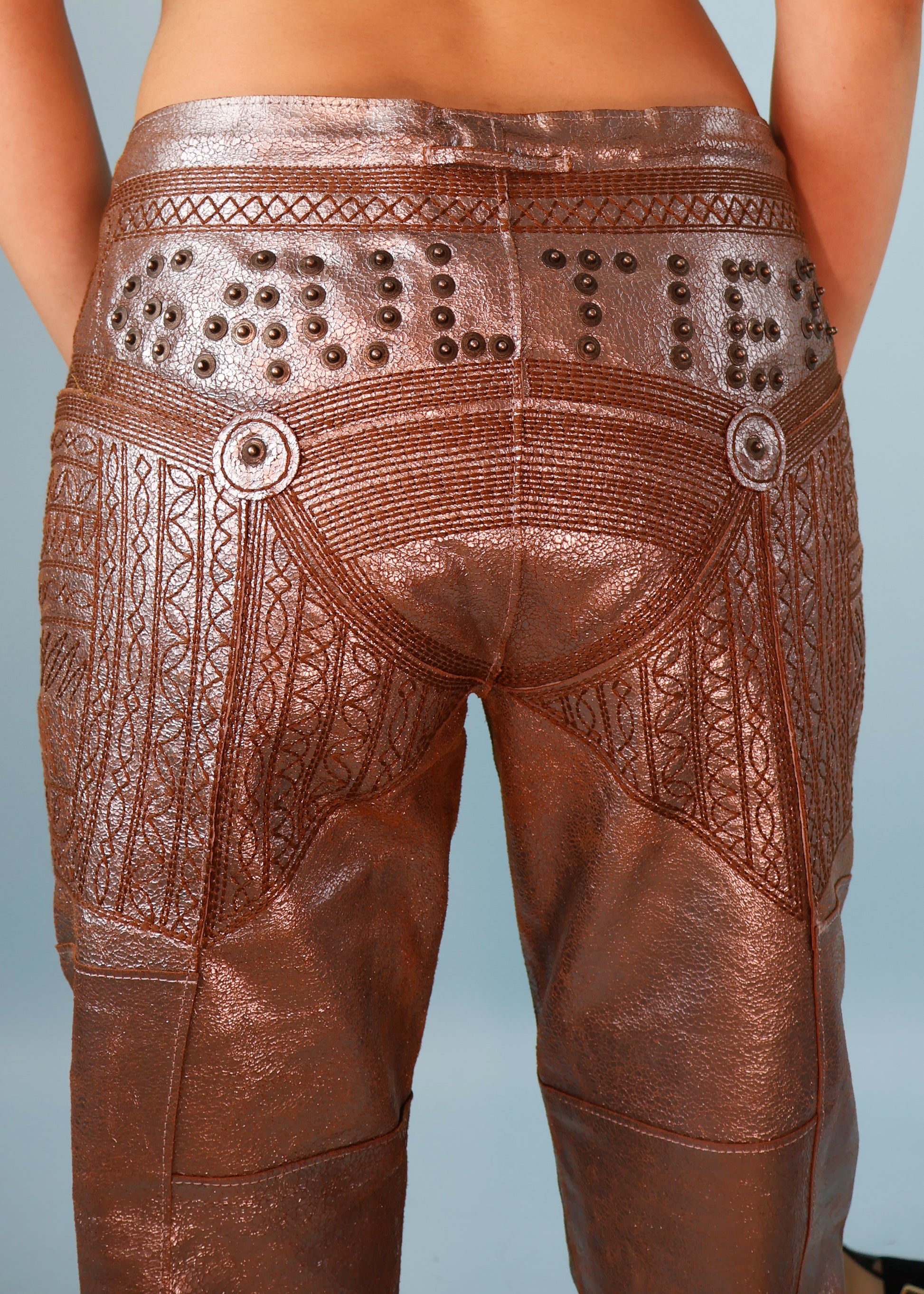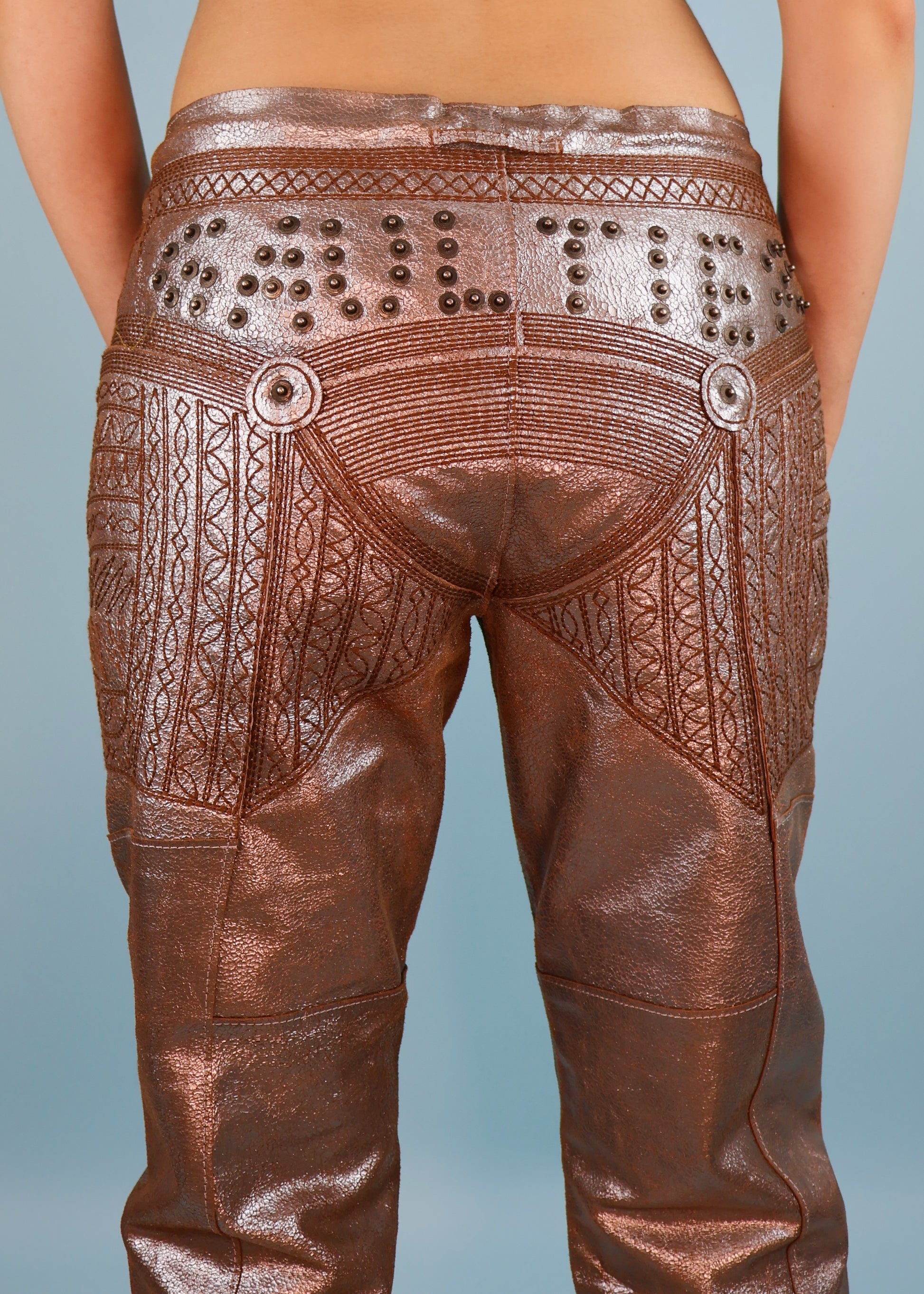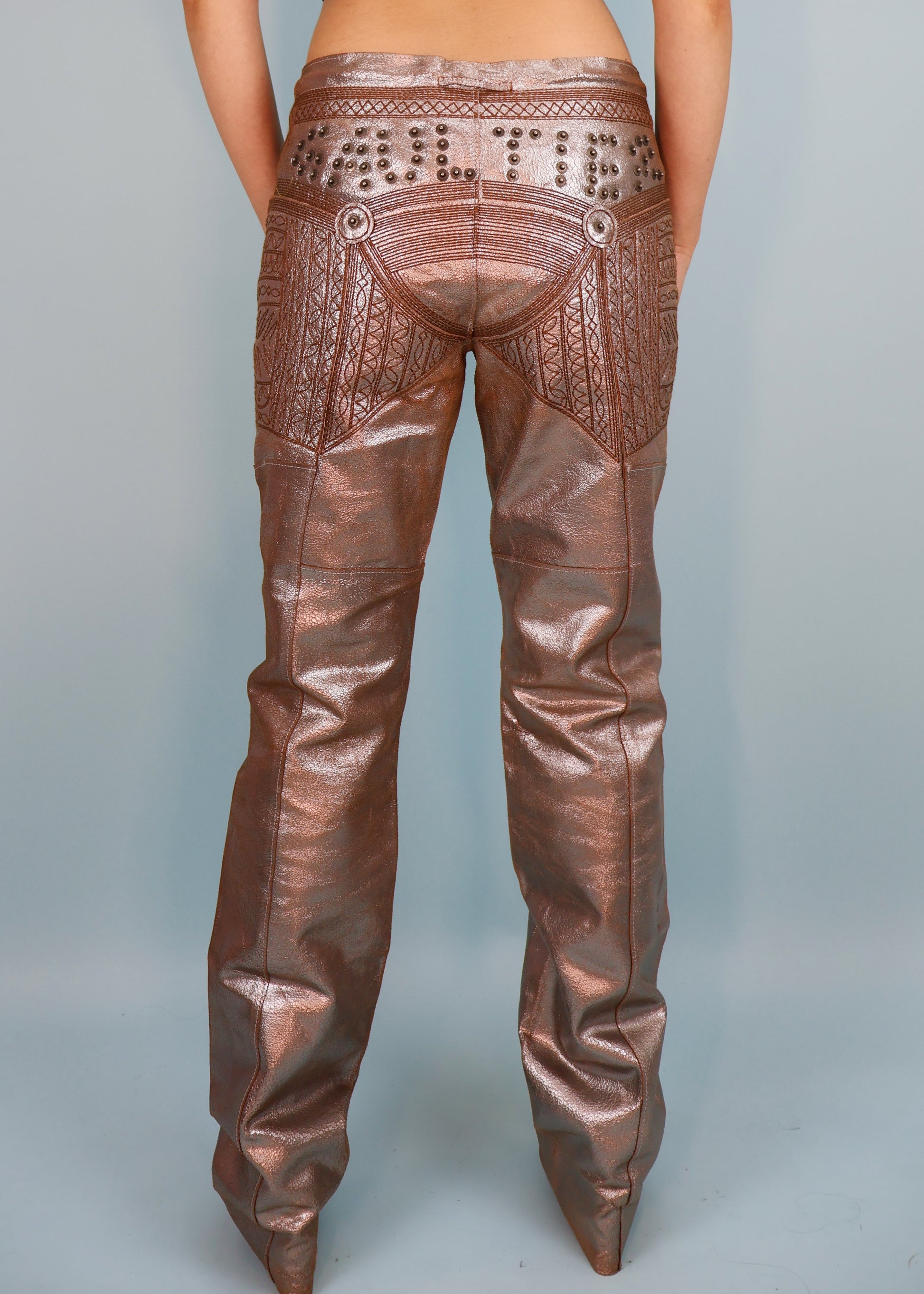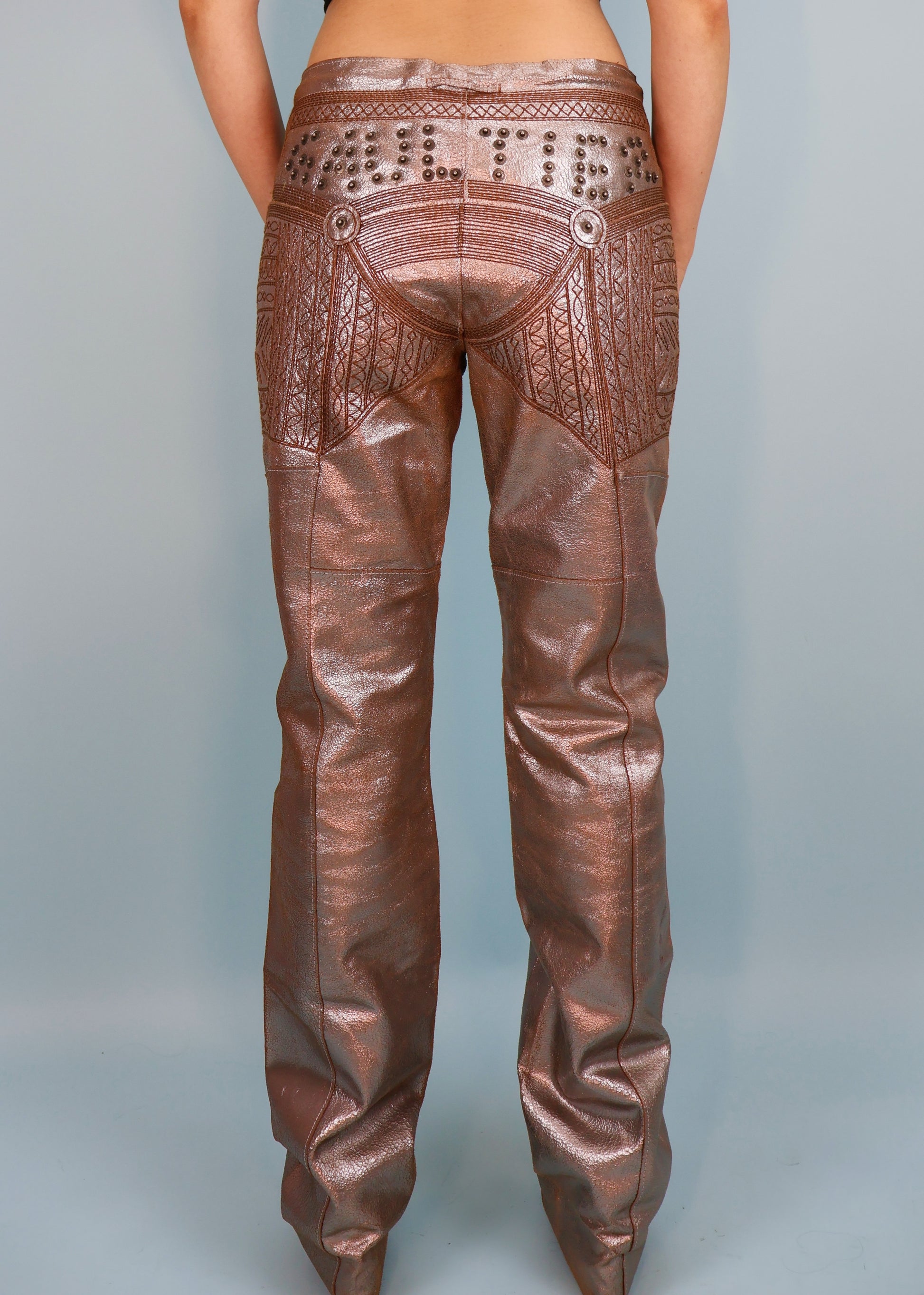 Jean Paul Gaultier Metallic Silver Leather Studded Spellout & Embroidered Pants