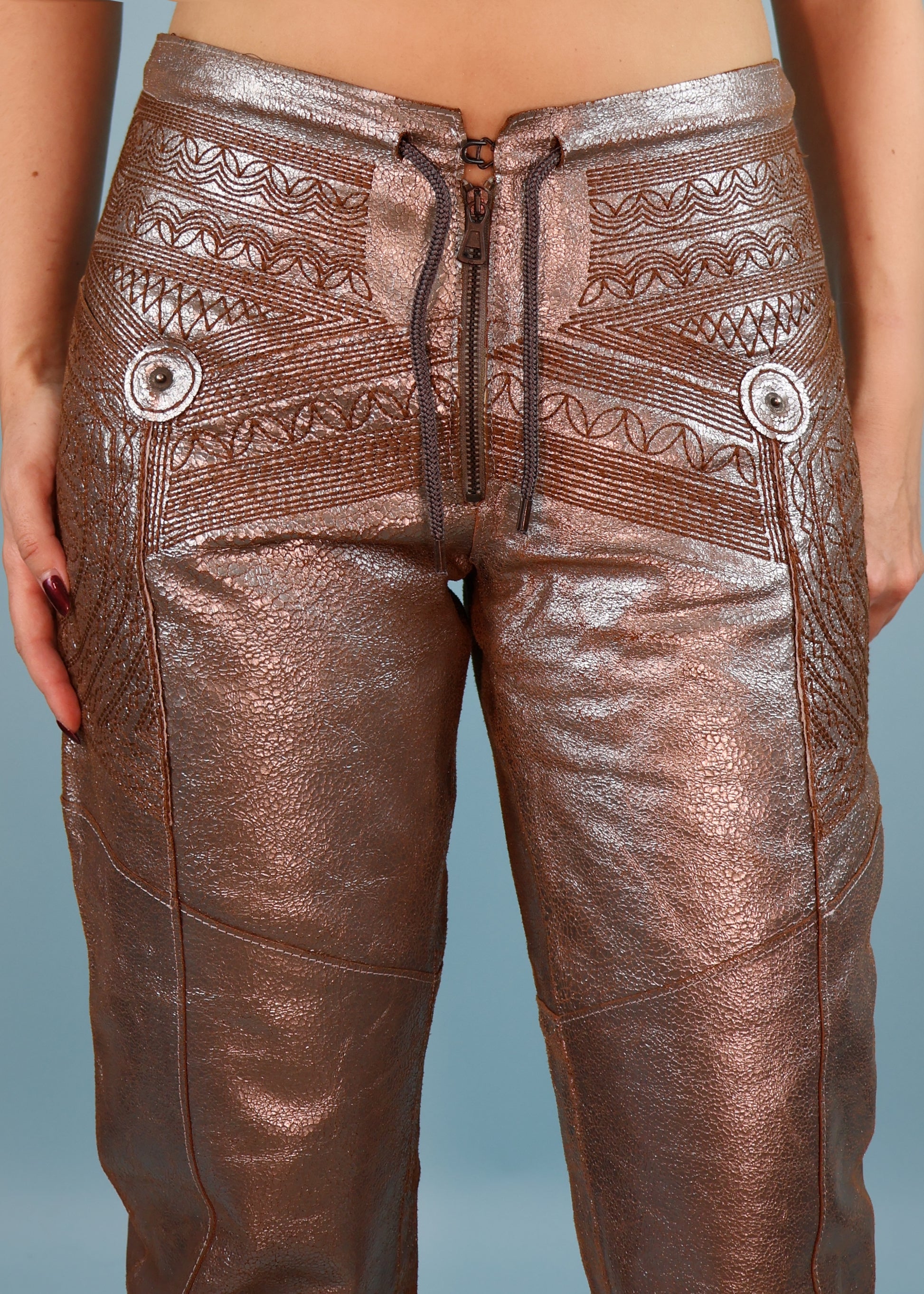 Metallic silver leather trousers