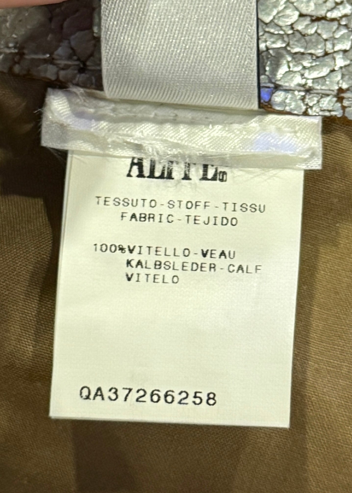 Crackle effect silver coating over calfskin leather