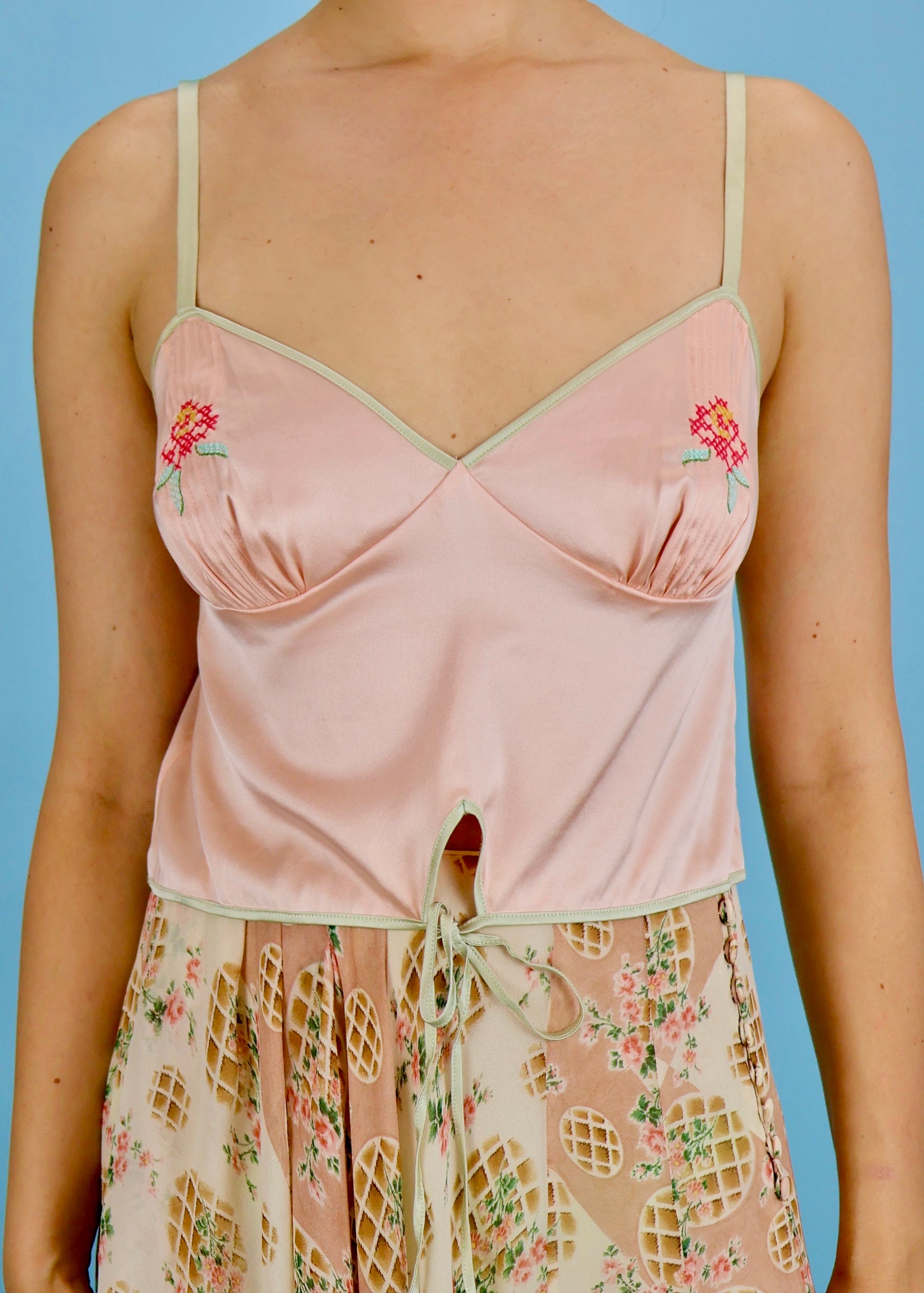 John Galliano Spring 2003 Pink Silk Satin Floral Cross Stitch Camisole Top