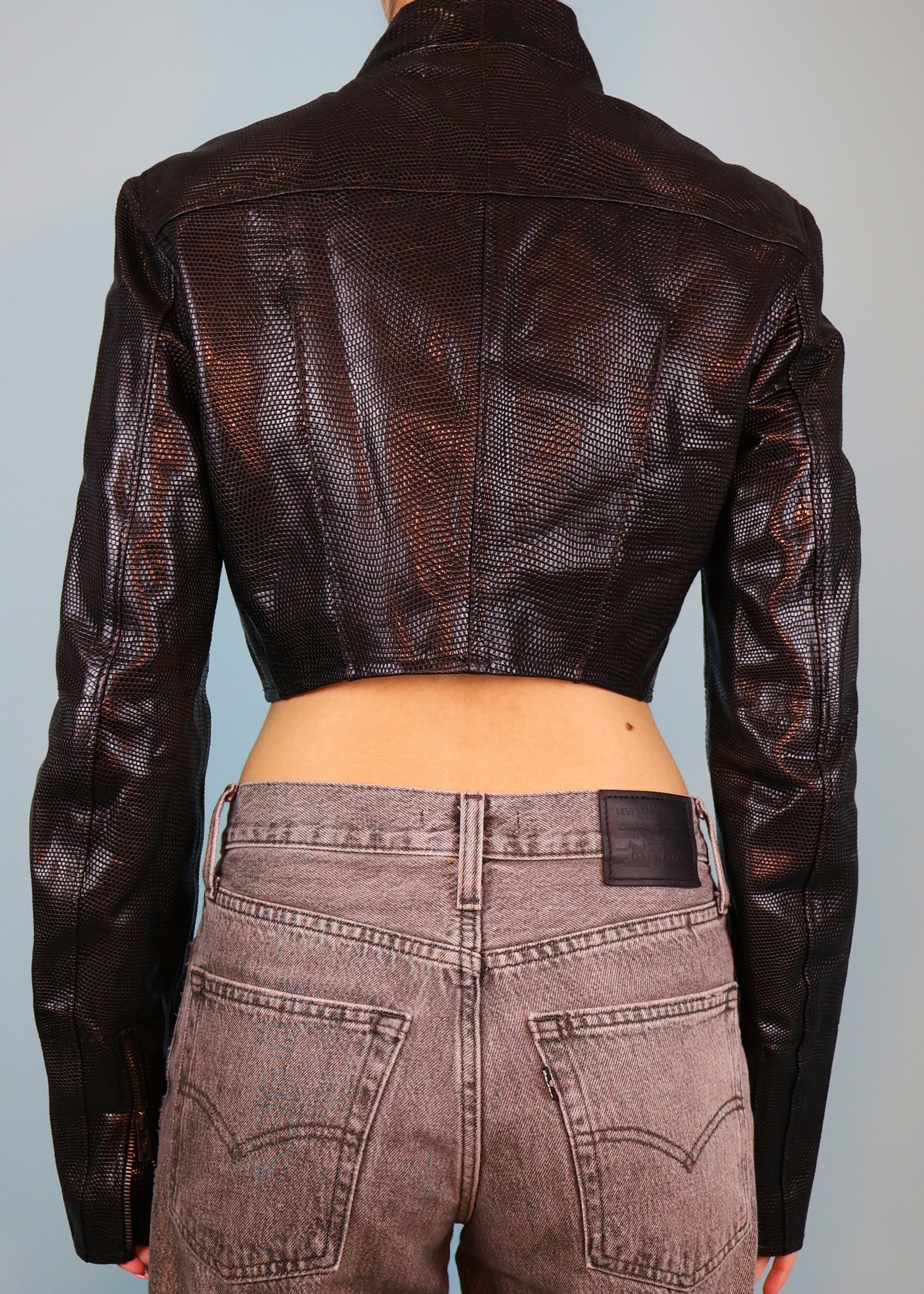 Black embossed croc effect leather jacket